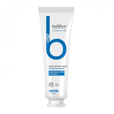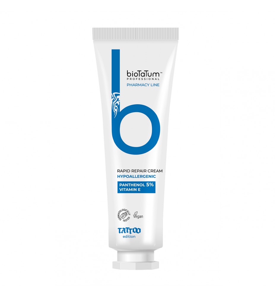 Poznaj krem Professional Rapid Repair marki BioTaTum, stworzony specjalnie z myślą o szybkiej regeneracji skóry po tatuażu. To prawdziwa magia w pielęgnacji ciała! Zależy Ci na maksymalnym bezpieczeństwie i ochronie przed podrażnieniami nowego tatuażu? Krem zapewnia oba te kryteria dzięki składnikom aktywnym, takim jak pantenol i witamina E. Produkt nawilża skórę, przyspiesza jej gojenie i pomaga przywrócić naturalne funkcje barierowe naskórka. Tworzy oddychającą warstwę ochronną, która zatrzymuje wilgoć niezbędną do wewnętrznej regeneracji naskórka. Pozbawiony barwników i substancji zapachowych krem jest bezpieczny dla skóry wrażliwej.